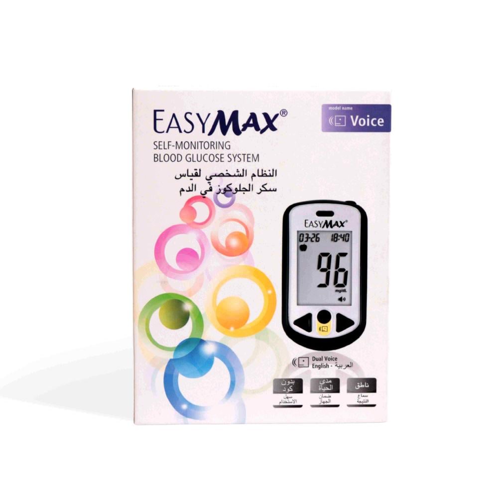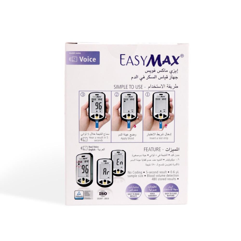 - السرعة في النتائج: يعطي جهاز فحص السكري EasyMax Voice نتائج قياس مستوى السكر في الدم خلال خمس ثوانٍ فقط، مما يوفر نتائج فورية وراحة في التحليل.